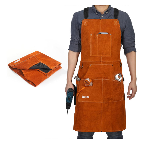 QeeLink Leather Welding Work Apron with 6 Tool Pockets, Heat & Flame Resistant Apron, 24″ x 36″, Adjustable M to XXXL